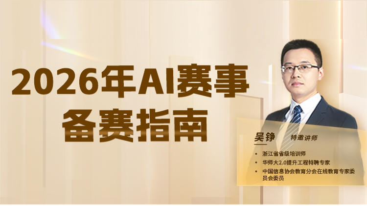 2026 AI赛事决胜手册:横扫AI竞赛的秘诀。 从赛事破局到课堂革命 | 掌握AI智能体+工作流搭建 | 告别陪跑,直达金奖。 我们不仅为您拆解2025年AI赛道最新赛事规则与金奖逻辑,更提供备课、教学、评价、学习任务管理四大场景案例直接落地的智能体技术使用及工作流搭建。 这是2026年教师最需要的一门AI课——既帮您拿下竞赛金奖,又让您成为学校里最懂AI教学的"智能体专家"。